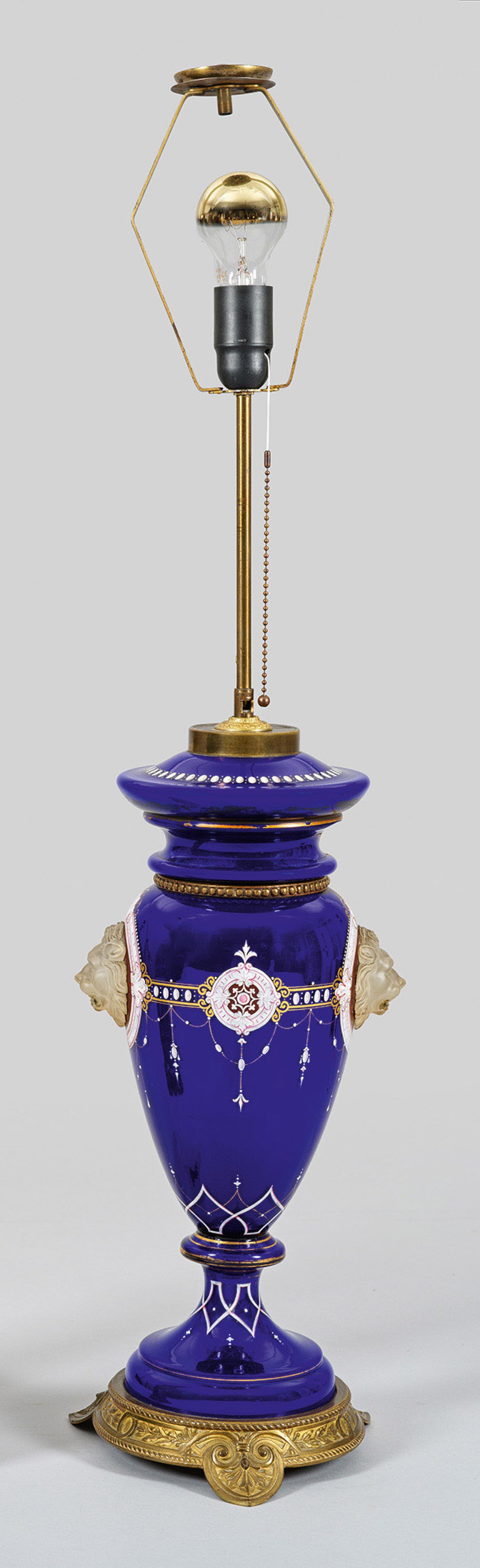 1-flg.; 2-tlg.; Dickwandiges Glas. Über gefußter Bronzemontierung Balusterform mit leuchtend kobaltblauem Grund. Ornamentale, polychrome Emailmalerei mit wenig Gold. Seitliche, reliefplastische Löwenappliken aus Glas. Oberhalb schlanker Schaft als Träger für ein Leuchtmittel. Reste alter Elektrifizierung. Minim. ber.; Lampen-H. 48 cm. Ges.-H. 92,5 cm.