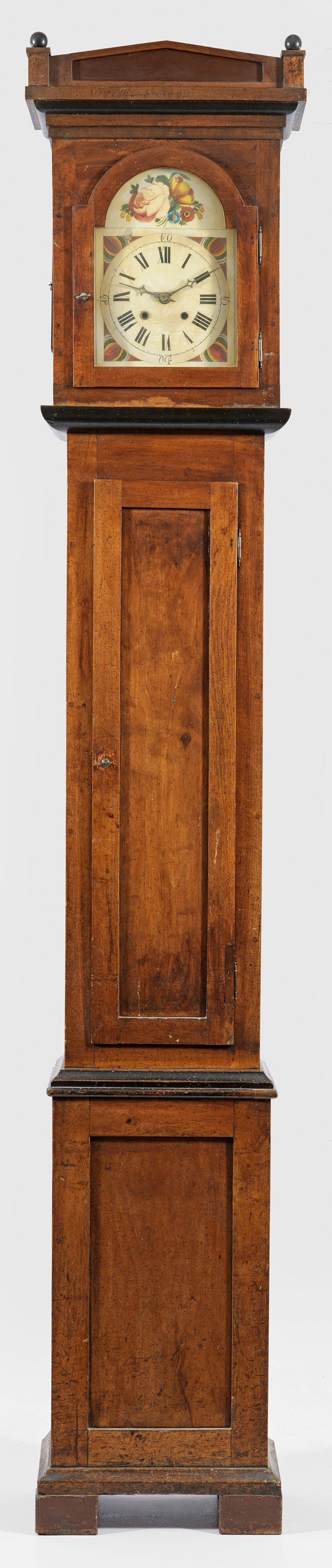 Nussbaum, teilw. ebonisiert. Gerader, hochrechteckiger Korpus auf gekantetem Sockel als Träger für leicht vorkragenden Uhrenkopf. Cremefarbenes Zifferblatt mit Blütendekor. Werk mit Ankerhemmung sowie Schlagwerk auf Glocke. Ohne Gewichte. Restaurierungsbedürftig. H. 283 cm.