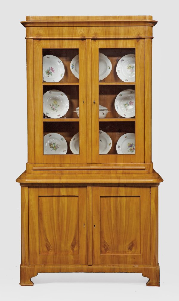 Kirschbaum, furniert. Gerader, rechteckiger, zweitüriger Korpus mit gerundeten Ecken auf gesägtem Zargensockel. Gering überstehende, gestuft ansteigende Deckplatte. Korrespondierender, zurückgesetzter, zweitürig sprossenverglaster Vitrinenaufsatz. H. 188 cm. 103 cm x 51 cm.