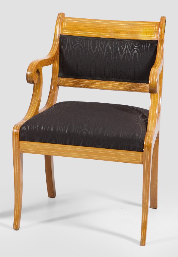 Rüster. Trapezförmige Zarge auf leicht ausgestellten, konischen Beinen. Gebogte Streben für schmale Armlehnen, in rechteckige, leicht zurückschwingende Rückenlehne übergehend. Sitzfläche und Lehne gepolstert und bezogen. Sitz-H. 45 cm.