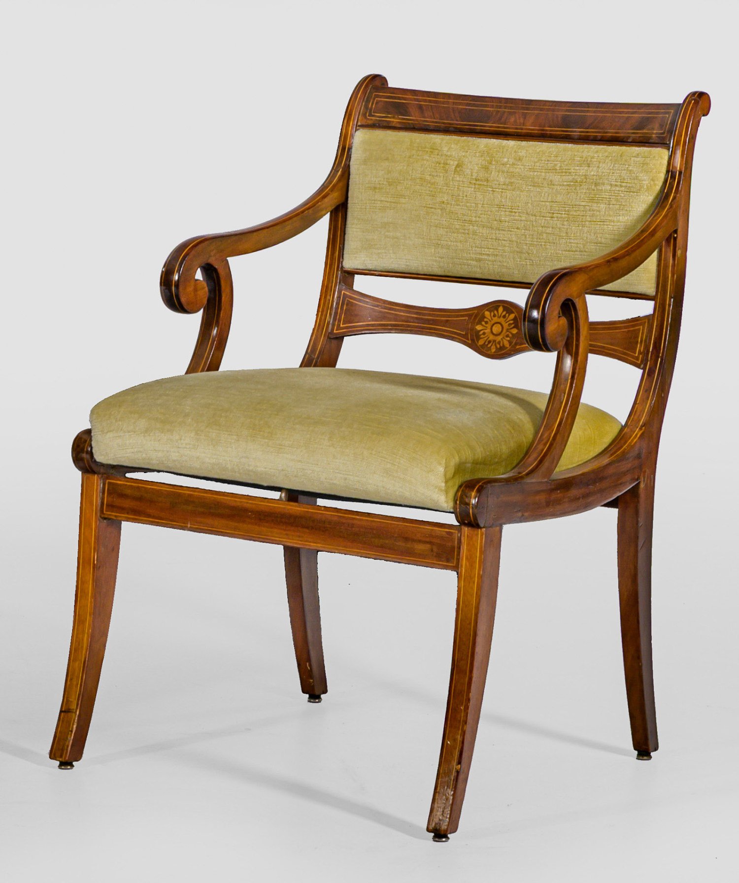 Mahagoni, furniert sowie Einlagen aus Zitronenholz. Trapezförmige Zarge aus ausgestellten Vierkantbeinen. Gebogte Stützen für schmale Armlehnen. Rechteckige Rückenlehnenrahmung mit balusterförmigem Mittelsteg. Gepolstert und bezogen. Sitz-H. 42 cm.