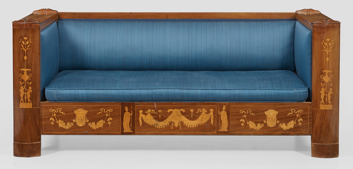 Helles Mahagoni, furniert sowie Einlagen aus Ahorn. Gerade Zarge, flankiert von breiten, schauseitig gewölbten Armlehnen. Flache Rückenlehnenrahmung. Flächendeckend teilw. figurale Einlagen. Lose Polsterauflage. H. 80 cm. 190 cm x 71,5 cm. Sitz-H. 40 cm.