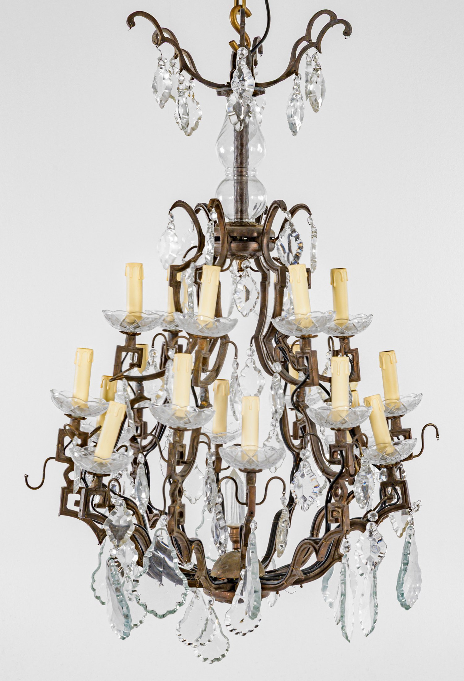 18-flg.; Bronze, patiniert und farbloses Glas. Balusterförmiger, offen gestalteter Korpus aus gekanteten und geschwungenen Streben als Träger für gestuft angeordnete Leuchtmittel. Reicher Behang aus großen, facettierten Prismen. Elektrifiziert. Fehlstellen. H. 100 cm. D. 63 cm.