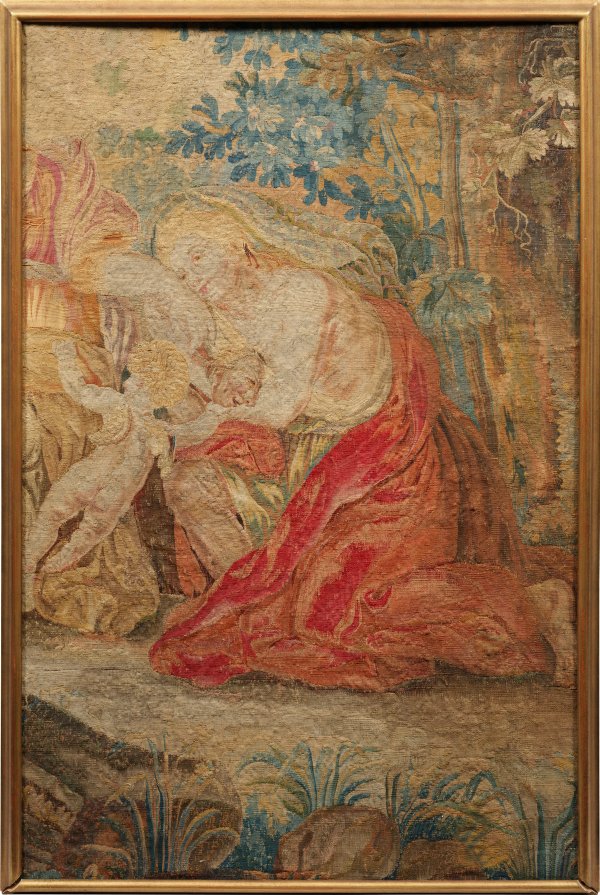 Wolle in unterschiedlichen Beige-, Braun-, Blau- und Grüntönen sowie in Rot, flach gewebt. Teil einer großen Tapisserie. Darstellung einer knienden Frau in Begleitung eines Putto mit Maske, in baumbestandener Landschaft. Auf Hartfaser kaschiert. Profilierter Rahmen. 120,5 cm x 80 cm.