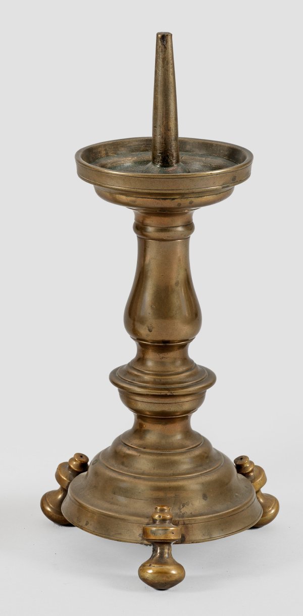 Messing. Über drei seitlich applizierten doppelten Kugelfüßen, aufgewölbter, mehrfach gestufter Stand, übergehend in einen Schaft mit Baluster und Scheibennodus. Gering vertiefte, ausschwingende Traufschale sowie hoher, sich konisch verjüngender Dorn.; H. 29 cm.