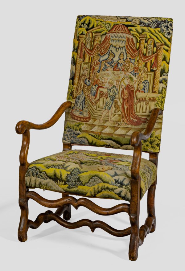 Nussbaum. Trapezförmige Zarge auf leicht geschweiften Beinen, unterhalb durch geschwungene Stege verbunden. Korrespondierende Stützen für schmale Armlehnen sowie hochrechteckige, leicht schräggestellte Rückenlehne. Gepolstert und schauseitig mit dekorativer Petit Point-Stickerei bezogen. H. 117 cm. 64 cm x 65 cm. Sitz-H. 42 cm.