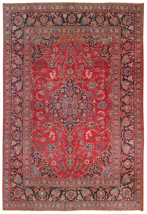 Persien. Wolle auf Baumwolle. Im roten Innenfeld dunkelgrundiges Zentralmedaillon und korrespondierende Ecklösungen. Flächendeckende Palmettenmusterung. Umlaufend breite Palmettenbordüre. Altersspuren. 275 cm x 375 cm.