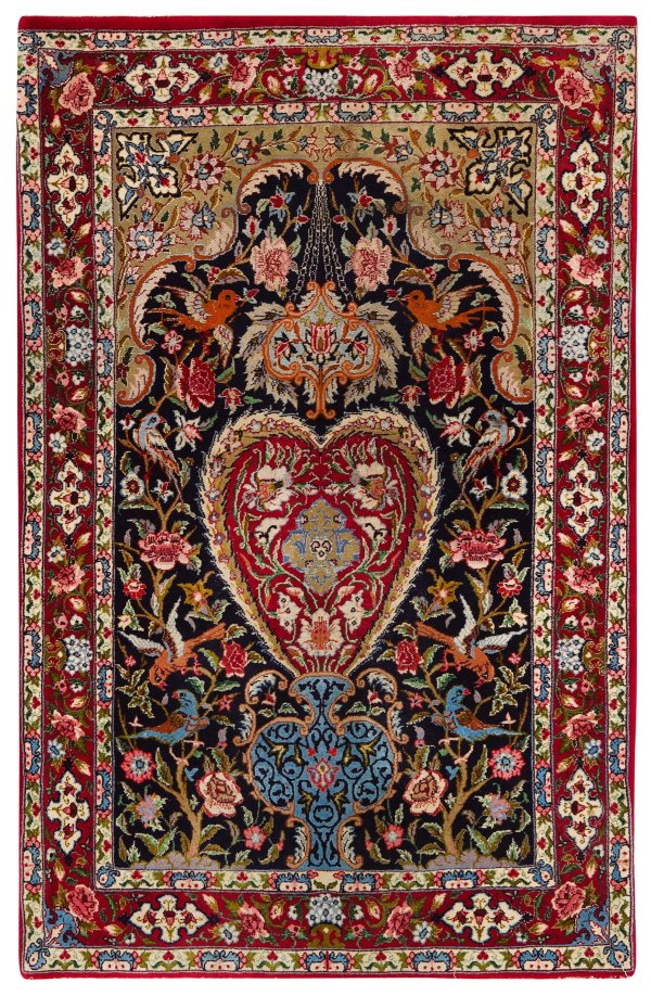 Persien. Wolle auf Seide. Feine Knüpfung. Im dunklem Innenfeld passig geschweifte Nische mit großem Vasenmotiv und Ampel. Flächendeckende Musterung aus Blütenzweigen und Vögeln. Umlaufend rotgrundige Bordüre. Fransenseiten verkürzt. 107 cm x 71 cm.