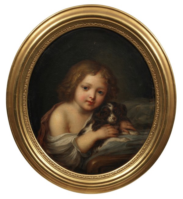 Feinmalerisches, reizvolles Kinderbildnis wohl nach einem Werk von Jean-Baptist Greuze (1725-1805), das u. a. von Alexander Ivanovich Tychagin (1818-1895) als Vorlage für Bildplatten der Kaiserlichen Porzellanmanufaktur Sankt Petersburg umgesetzt wurde. Öl/Lwd.; Verso altes Inventaretikett, wohl aus dem Besitz der Großfürstin Olga Nikolaevna Romanova (1822-1892). 53 cm x 44,5 cm. Rahmen.