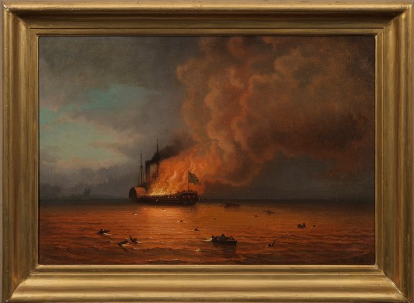 Blick auf einen brennenden Segeldampfer. Im Vordergrund einige Rettungsszenen mit kleineren Booten und um Hilfe rufender Besatzung. Atmosphärisch gestimmtes Marinebild mit der Darstellung des Brandes der "Caradock" und des durch das lodernde Feuer lebendig bewölkten Himmels. Rücks. bez. "Brand (?) und Untergang (?) 'Caradock' an stillen (?), 24. Juni 1859". Öl/Lwd.; 65 cm x 47 cm. Rahmen.