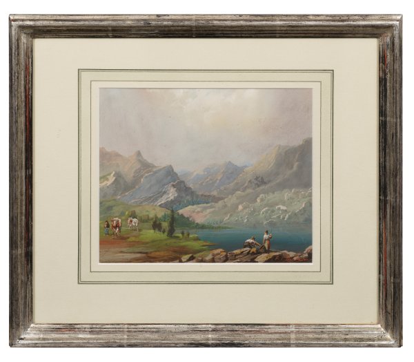 Atmosphärische, romantisch aufgefasste Landpartie an einem klaren Gebirgssee, belebt durch einen Rinderhirten mit seinem Vieh und zwei Fischern beim Einholen ihrer Netze. Charakteristische, stimmungsgeladene Arbeit des bömischen Künstlers Duchoslav, der bei Josef Matej Navrátil und Karel Nacovský lernte. Gouache/Papier. R. u. sign. in Rot. 20,3 cm x 23,6 cm (Passepartoutausschnitt). Rahmen.