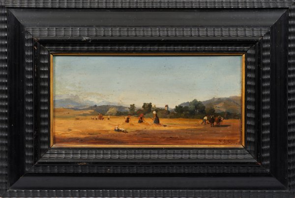 Vor dem Motiv aufgenommene Naturstudie bei der Erntearbeit vor dem Hintergrund einer weiten Voralpenlandschaft, gemalt im typischen gestreckten Münchner Handtuchformat. Mit raschem Pinsel hält der Künstler die Atmosphäre eines Augenblicks in ihrer Farb- und Lichtwirkung fest. Salzers künstlerisches Schaffen ist im Wesentlichen auf seine Münchner Jahre zwischen 1846 und 1863 begrenzt, weshalb der gebürtige Heilbronner der Münchner Malerschule zugerechnet wird. Öl/Papier, auf Leinwand kaschiert. R. u. sign.; Berieben. 17,5 cm x 33,5 cm.