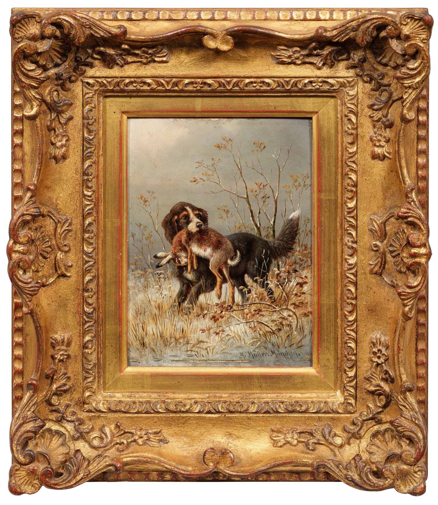 Winterlich gestimmte, karge Landschaft mit jagdlicher Tierdarstellung. Fein nuanciertes, lebendig geschildertes Werk Müllers, der bei seinem Vater, Moritz Müller gen. Feuermüller und Wilhelm von Kaulbach ausgebildet wurde. Öl/Karton. R. u. sign. mit Ortsangabe München. 18,2 cm x 13,2 cm. Rahmen.