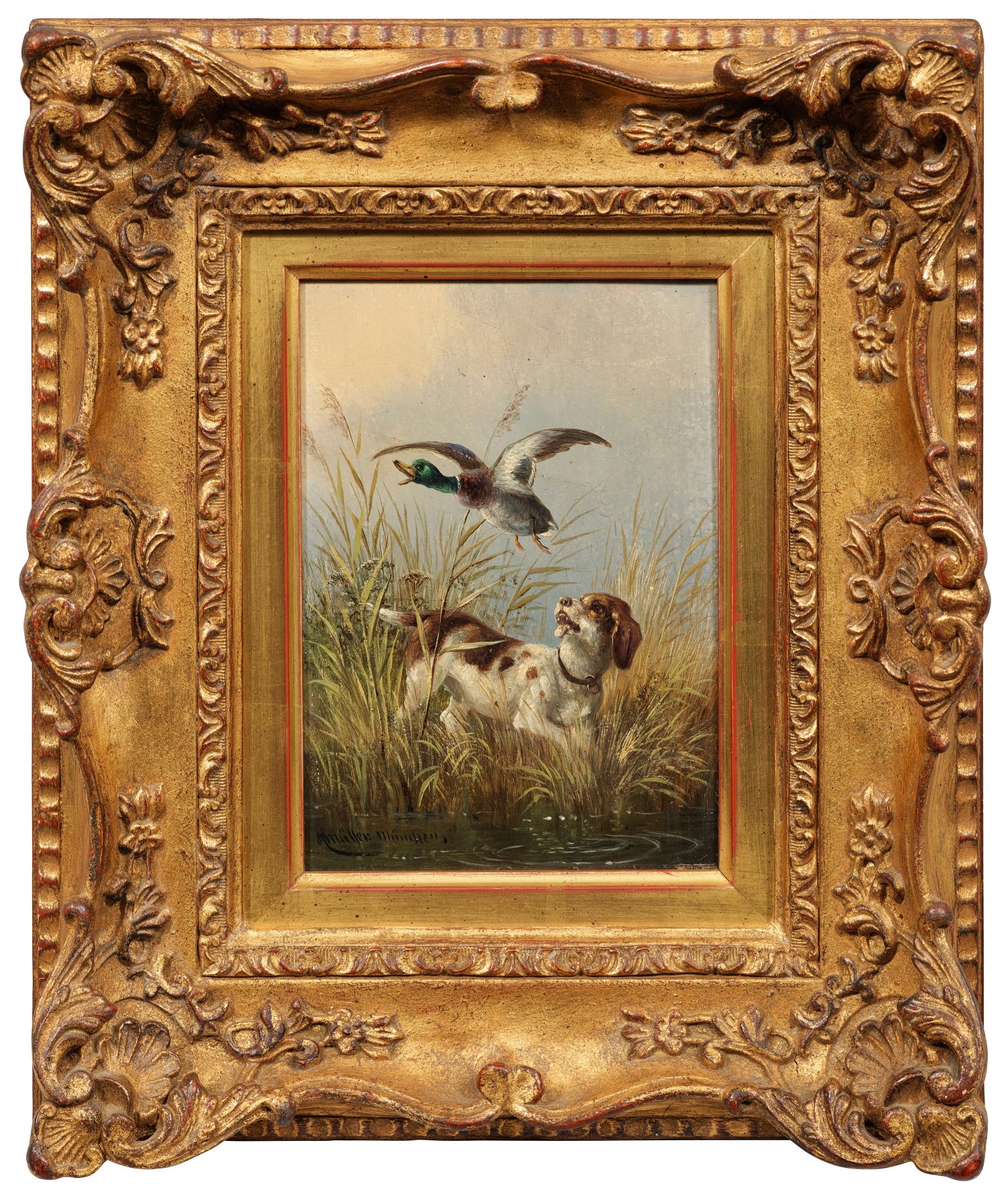 An einem mit Schilf bewachsenen Ufer scheucht ein English Pointer einen Erpel auf, der aufgeregt davonfliegt. Auschnitthaft komponiertes, typisches Werk des Münchner Tiermalers Moritz Müller, der Schüler seines Vaters und Wilhelm von Kaulbachs war. Öl/Karton. L. u. sign. mit Ortsangabe München. 18 cm x 13 cm. Rahmen.