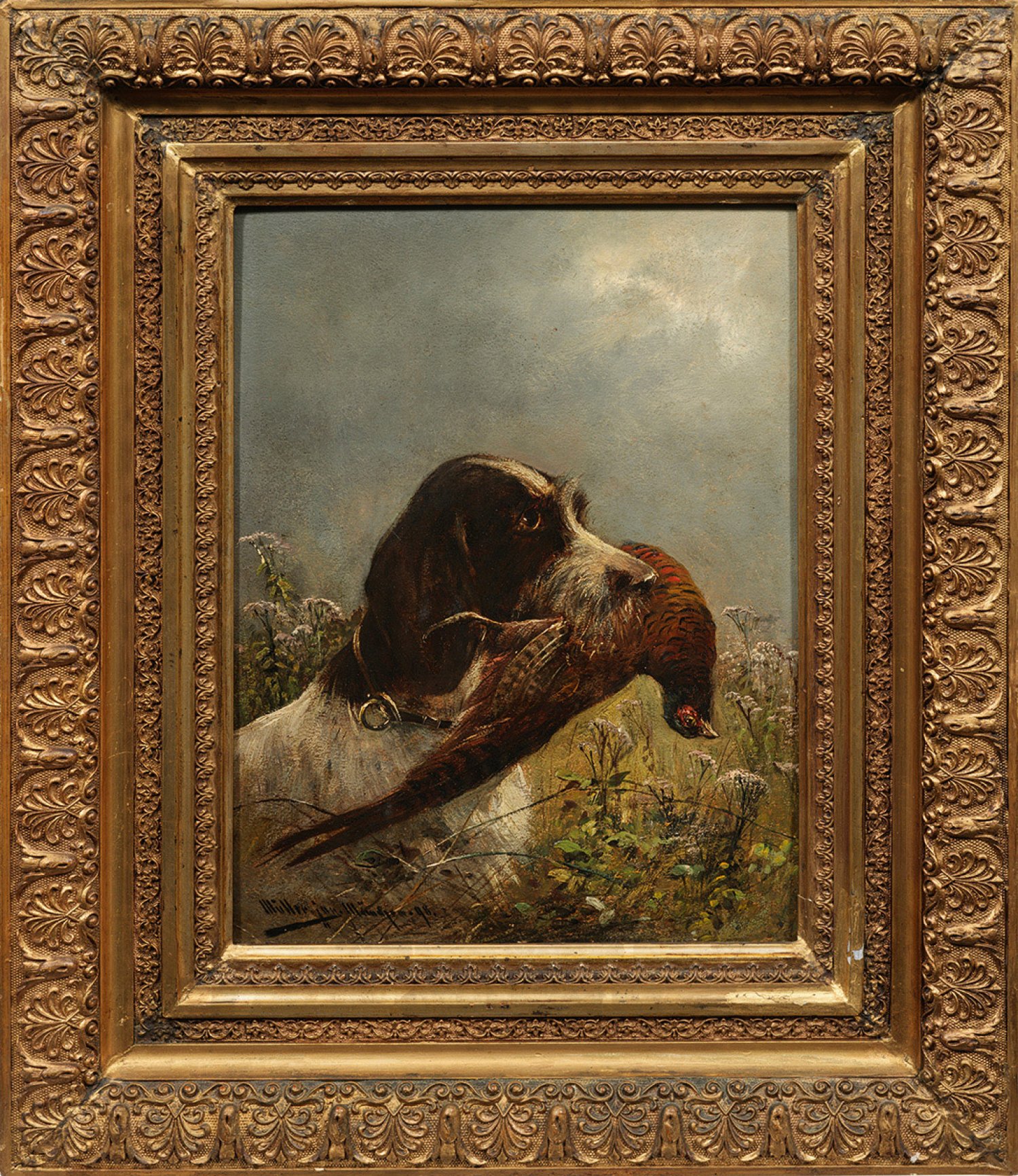 In einer Wiese mit Wildblumen sitzender Jagdhund, den Vogel im Maul haltend. Naturalistisches, motiv- und stiltypisches Werk des bekannten Wild- und Jagdmalers, der aus einer Künstlerfamilie stammte und bei seinem Vater Moritz Müller dem Älteren (1841 - 1899) lernte. Seine Jagdgemälde waren Anfang des 20. Jhs. so populär, dass sie auch als farbige Postkarten weite Verbreitung fanden. Öl/Malkarton. L. u. sign. mit Zusatz "jun." und Ortsangabe München. 33,5 cm x 25 cm. Rahmen.