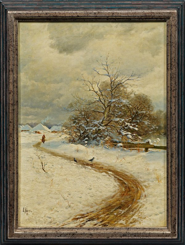 Frühes, realistisches Werk des Landschaftsmalers aus der Zeit seines Studiums an der Kaiserlichen Kunstakademie in St. Petersburg. Yudin, der 1887 und 1888 Medaillen der Akademie gewann, ließ sich 1902 in Taschkent nieder, wo er mit seinen Plein-air-Studien und Werken in der Tradition der russischen Landschaftsmalerei des 19. Jhs. erfolgreich war. Sein kleines, bekanntes Oeuvre zeichnet sich durch eine hohe Beherrschung in der Zeichnung, Klarheit der Komposition sowie das Interesse für die Lichtwirkungen bei Sonnenuntergangs- und Nachtstimmungen aus. Zwei Gemälde Yudins befinden sich im Russischen Kulturzentrum in Kaliningrad. Öl/Lwd.; L. u. sign. u. dat. (18)88. 60 cm x 45 cm. Rahmen.