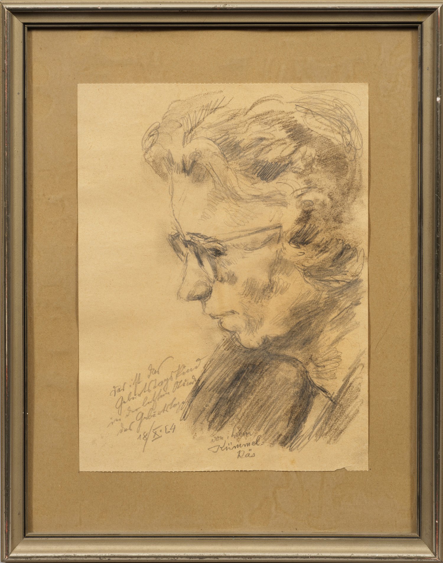 In kraftvollen, dynamischen Strichen ausgeführtes Profilbildnis von Maria Küsters mit gewelltem Haar und Brille. Bleistift/Papier. Sign. "von ihrem Kümmelkäs" sowie mit datierter Widmung "das ist das Geburtstagskind in ... Geburtstag (/) 18/X.(19)64". 27,6 cm x 21 cm. Rahmen.