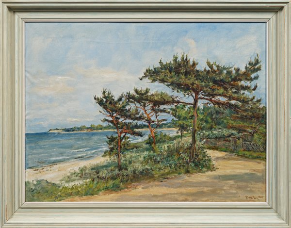 Atmosphärische Ostseelandschaft mit ihren charakteristischen Motiven Meerblick, Sandstrand und bizarre Kiefern. Matern zählt zu den Malern der Künstlerkolonie Gothmund bei Travemünde. Öl/Lwd.; R. u. sign. u. dat. 1958. 61 cm x 80 cm. Rahmen.