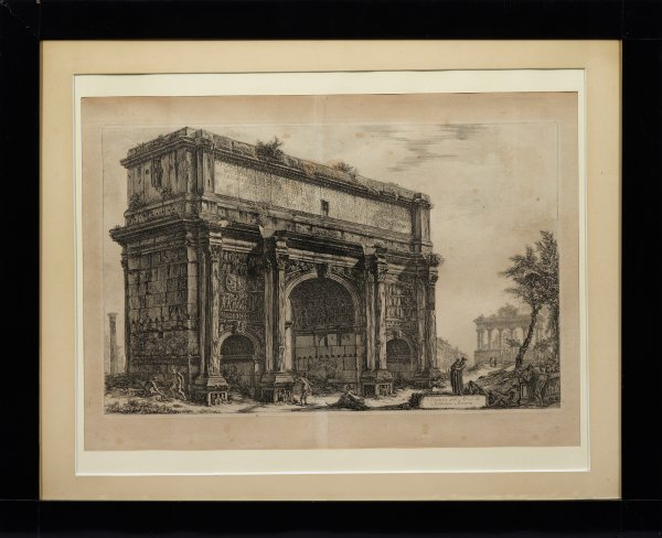 Radierung/Bütten. In der Platte bez. "Cavalier Piranesi F." sowie mit Titel. Ansicht des Bogens des Septimius Severus, im Hintergrund der Tempel des Saturn. Aus der Folge "Vedute di Roma", erstmals erschienen 1747-1778. Focillon 754; Hind 99. Plattenmaß 47,5 cm x 71,5 cm. Rahmen.