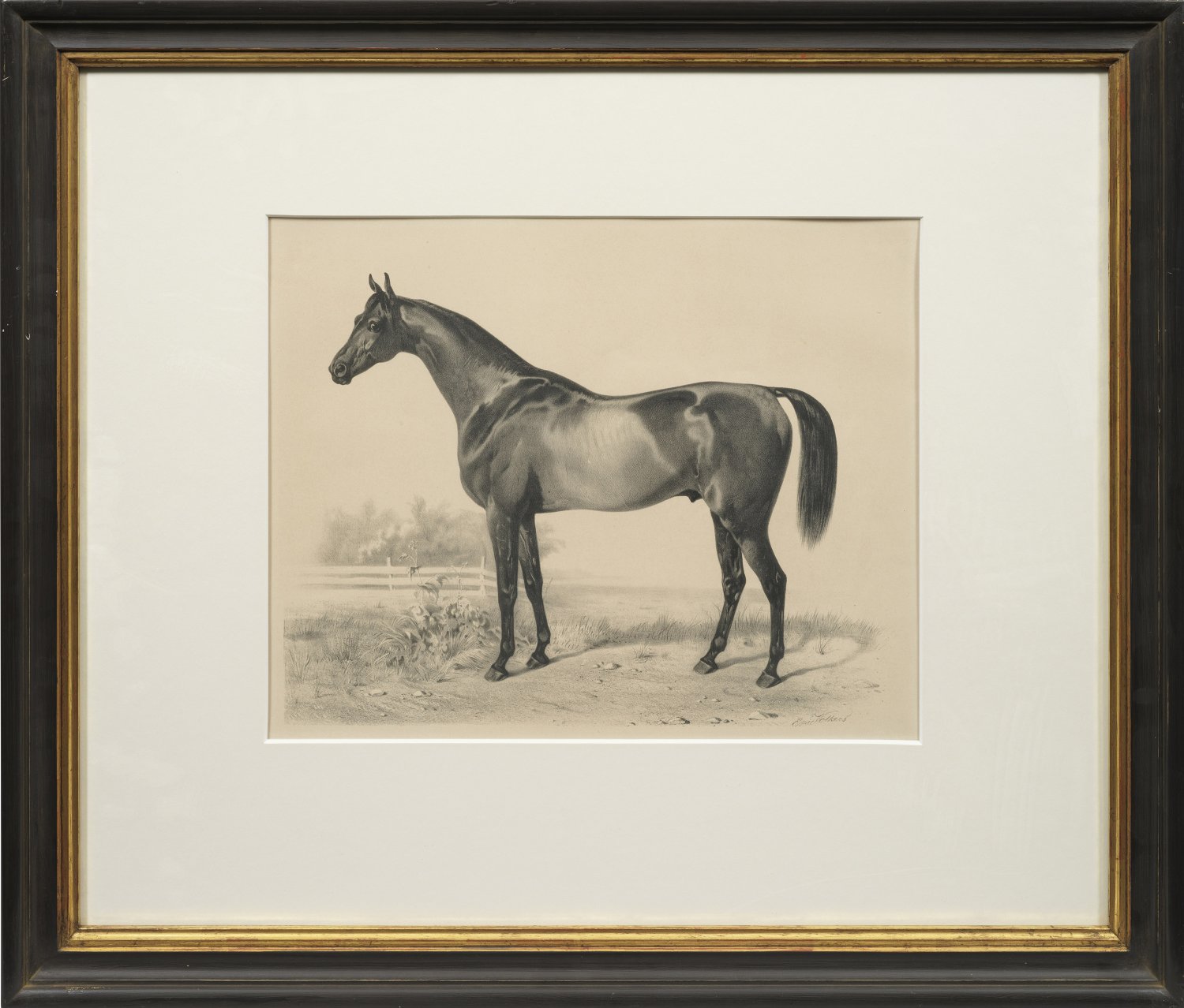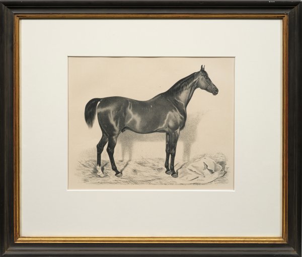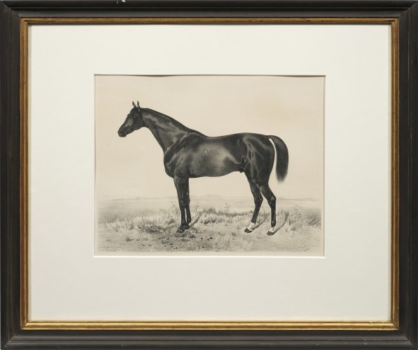 Lithographien/Papier. Je im Stein sign.; Erschienen in der Folge "en von Pferden aus dem königlichen Institut Celle, 1857", gedruckt und erschienen im Verlag der Artistischen Anstalt, Gustav W. Seitz, Wandsbek 1857. Dabei die braunen englischen Vollbluthengste "The Calculator", "Sampson" und "Westow". 33,7 cm x 41,4 cm (Passepartoputausschnitt). Rahmen.