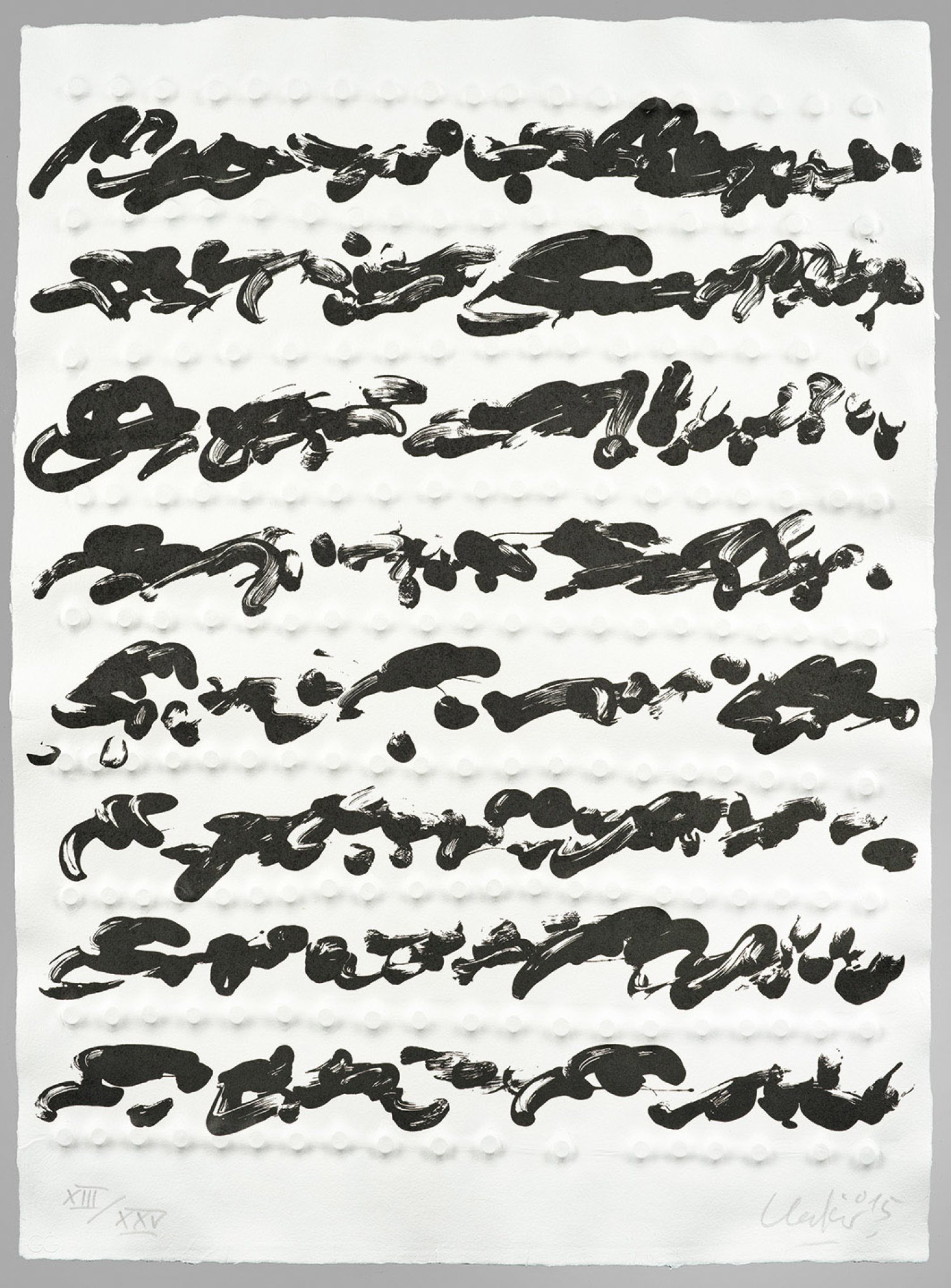 Siebdruck und Prägedruck/Bütten, 2015. Sign., dat. 2015 und nummeriert XIII/XXV. Blindstempel des Verlegers. Blatt 4 der 9-teiligen Mappe "Friedensgebote", erschienen in einer Auflage von 100 + XXV + E.A. Expl. bei Geuer & Geuer Art, Düsseldorf. Blatt 71 cm x 53,8 cm.