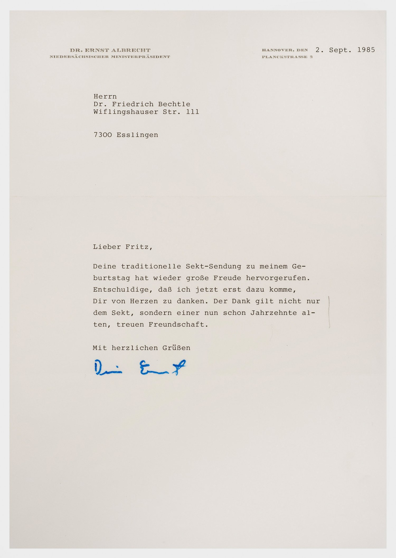2 maschinenschriftliche Briefe m. Unterschrift, 1985/87, 4°-Format, 1 x mit Wasserzeichen, 3 Zeilen am Rand von fremder Hand mit Bleistift markiert, 2 Grußkarten mit eigenhändigen Ergänzungen und Unterschrift, 1 x mit Umschlag 1978/79, 11,6 x 17,6 cm. Der niedersächsische CDU-Politiker und spätere Ministerpräsident Ernst Albrecht (1930 Heidelberg - 2014 Burgdorf) bedankt sich bei Friedrich Bechtle in freundschaftlichem Ton ("Lieber Fritz") für dessen Grüße zu Geburtstagen bzw. Jahreswechseln und die mitgesandten Geschenke. Minim. Alters- und Gebrauchsspuren.