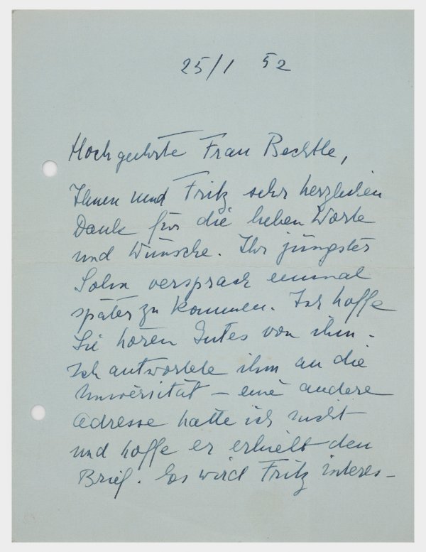 Eigenhändiger Brief mit Unterschrift, 3 S. auf 1 Bl., 25.1.'52, blaues Papier (leicht verblasst), 4° quer-Format, gefaltet, gelocht; 1 x eigenhändige, signierte Grußkarte mit beigelegtem, gepressten Blumensträußchen, von fremder Hand dat. "Dez. 1969"; vorgedruckte Grußkarte mit eigenhändiger Erg. u. Unterschrift. Minim. Alters- und Gebrauchsspuren, minim. fleckig.