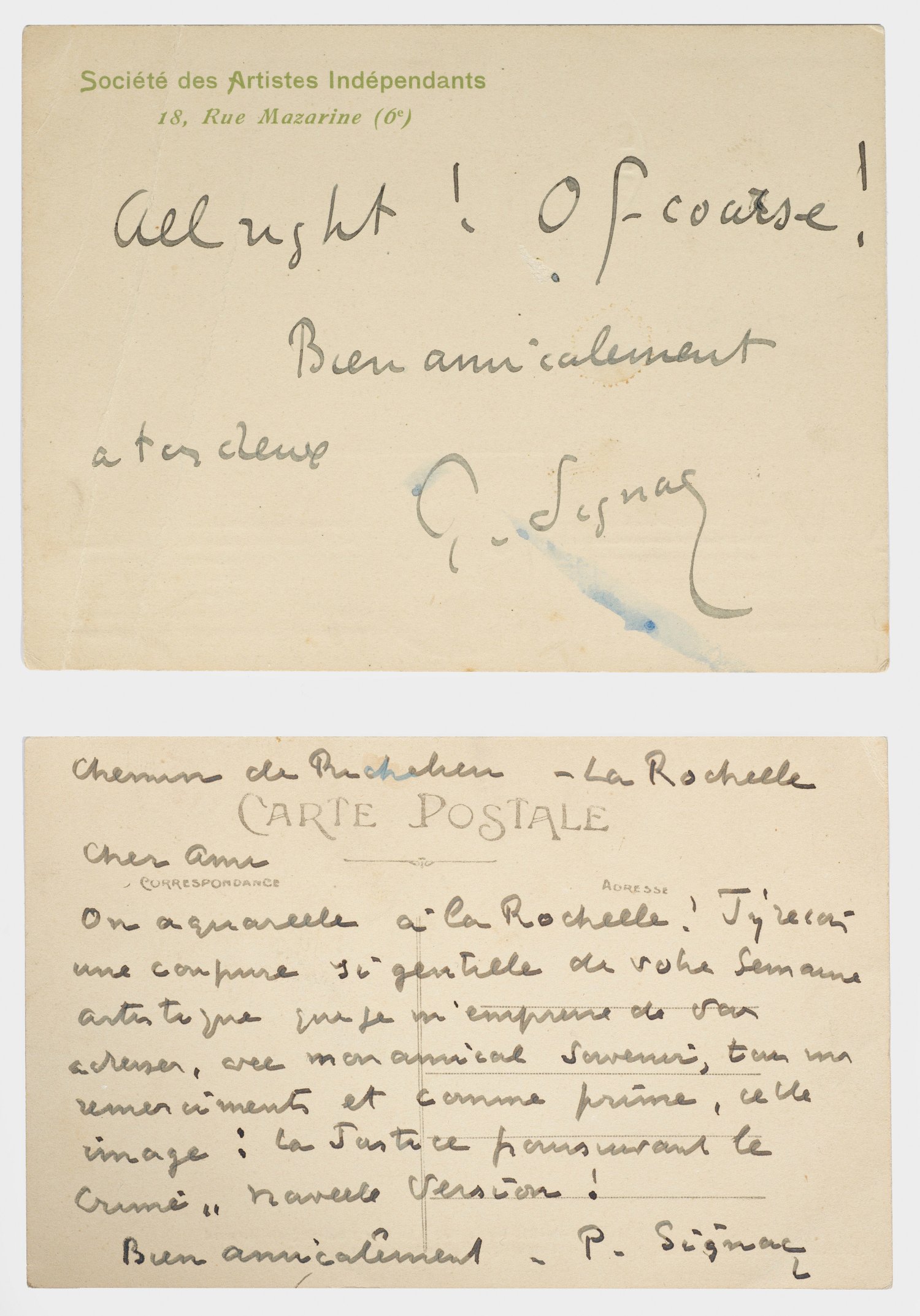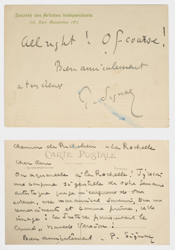 Eigenhändiger Brief auf der Rückseite einer Ansichtskarte ("Saint-Martin-de-Ré - Le forcat cul-de-jatte Bernard s’embarquant pour la Guyane"), Unterschrift, La Rochelle, ohne Datum.Beigegeben Karte mit eigenhändigen Grüßen und Unterschrift, Briefkopf der "Société des Artistes Indépendants" in Paris. Der französische Maler und bedeutendste Künstler des Neoimpressionismus, Paul Signac (1863-1935) berichtet einem befreundeten Künstler von seinen Aquarellarbeiten auf La Rochelle und bedankt sich bei ihm für dessen Urlaubsgrüße mit dem auf der Vorderseite der Karte abgebildeten Foto eines beinamputierten Sträflings, der nach Guyana abtransportiert werden soll: „…la Justice poursuivant le Crime, navale Version!“ (Die Gerechtigkeit verfolgt das Verbrechen, Marineversion!). 8,8 cm x 13,8 cm. Minim. Alters- und Gebrauchsspuren.