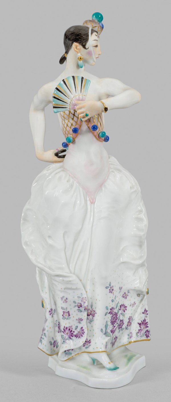 Auf einem kleinen, geschweiften Sockel stehende spanische Tänzerin, in einer eleganten Drehung mit Fächer und Kastagnetten in den Händen. Polychrome Bemalung mit etwas Gold. Entw. Paul Scheurich, 1931. Modell-Nr. 67077. Entw.- Bez. mit Dat.; Schwertermarke. H. 28 cm.