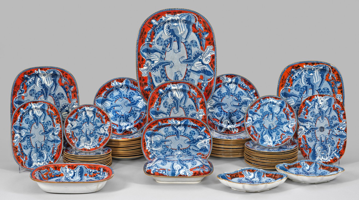 66-tlg.; Weichporzellan. 12 Dessertteller, 13 mittlere Teller, 14 tiefe Suppenteller, 15 flache Speiseteller, 2 vierpassige Beilagenschalen, große Schale, 6 unterschiedlich große Anbietplatten, Abtropfschale, mittlere Schale, Deckelschüssel. Vier geschuppte Fo-Hunde im netzartigen Rund des Spiegels zwischen gewundenen Schlangen stehend. Tempelarchitektur und baumbestandene Landschaft auf siegelrotem Grund. Blaudekor mit olivgrüner Kontur. Partiell best. und teilw. rep./rest.; Ungemarkt. Anbietplatten von 27,5 cm x 20 cm - 43,5 cm x 33 cm.; Teller-D. von 19 cm - 25,5 cm.