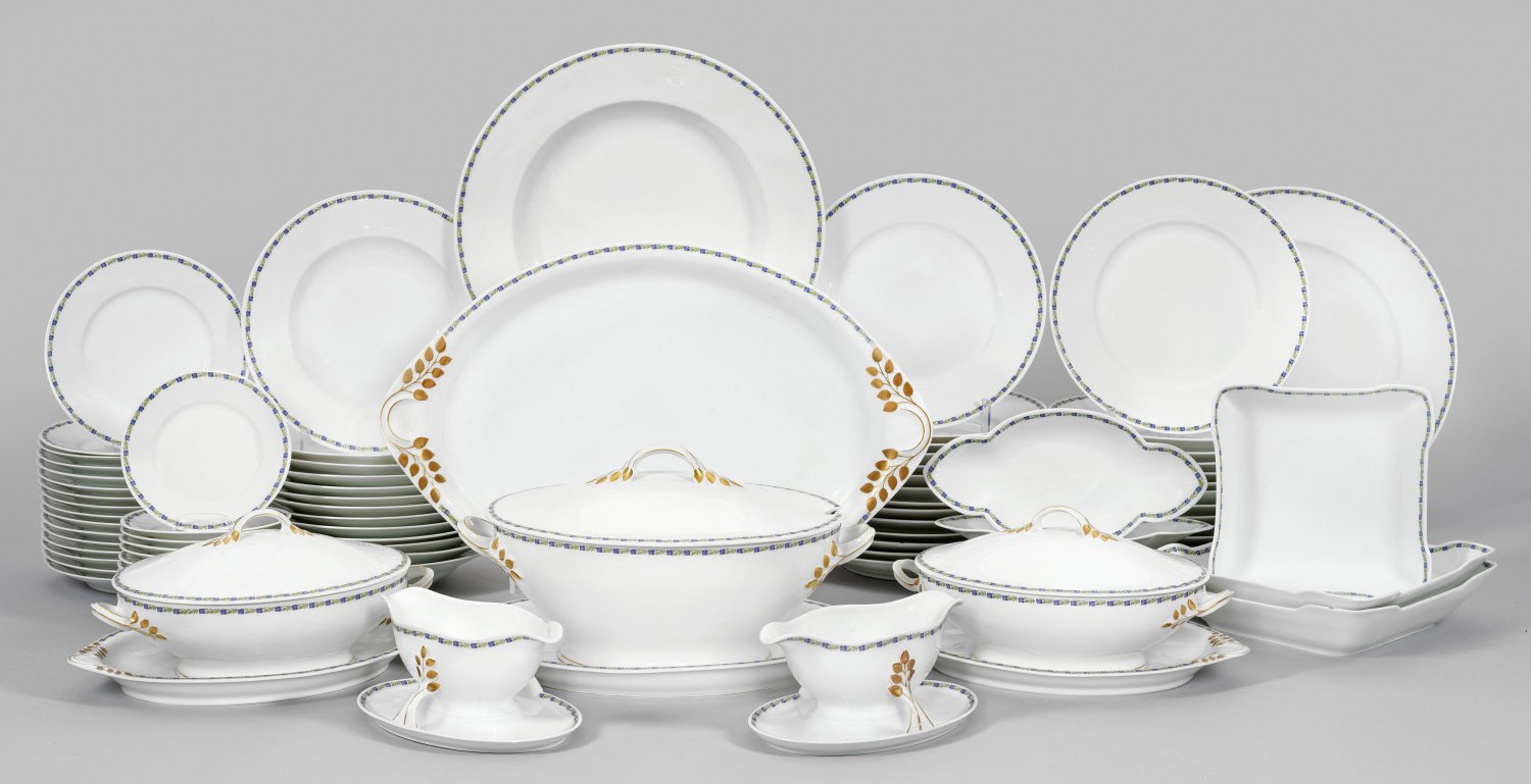 85-tlg.; 4 ovale, verschieden große Anbietplatten, 2 vierpassige Schälchen, 2 Saucieren fest auf Untersatz, drei verschieden große Deckelterrinen, 3 viereckige Gemüseschalen, 27 Speiseteller, 14 Suppenteller, 16 Dessertteller, 12 kleine Teller, 2 große runde Teller. Florale Bordüre mit Lorbeerzweigen. Vergoldete, blattreliefierte Henkel und Griffe. Polychrom- und goldstaffiert. Wenige minim. best.; Partiell ber.; Manufakturmarke. Anbietplatten von 33 cm x 22 cm - 52 cm x 34 cm. Speiseteller-D. 25,5 cm.