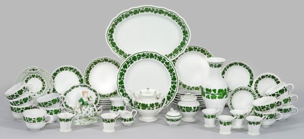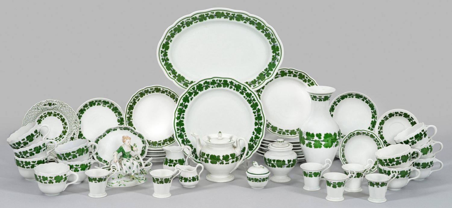 43-tlg.; Kanne, Sahnegießer, Zuckerdose, 10 Kaffeetassen mit 6 Untertassen und 3 runden Untertassen, 5 Dessertteller, Speiseteller, 3 kleine Durchbruchteller, Anbietplatte, Vierpassschälchen, Rundschälchen, 6 Mokkatassen mit Schwanenhenkel mit Untertassen, kleiner Sahnegießer, kleine Zuckerdose, 7 Kuchenteller, Vase, figürliche Saliere. Umlaufender Weinlaubdekor in unterglasurgrüner Malerei. Dekor-Entw. Johann Samuel Arnhold. Eine besch. Tasse als Beigabe. Wenige minim. best./rest.; Schwertermarke. Kannen-H. 13,5 cm.; Anbietplatte 35 cm x 25 cm.; Vasen-H. 23 cm.