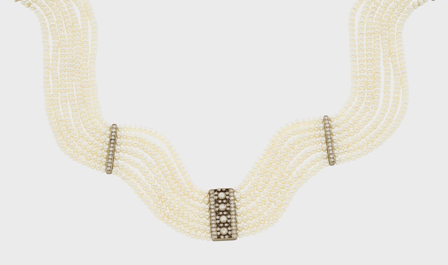 Weißgold, gest. 585. 7-reihige Kette aus schneeweißen Zuchtperlen von ca. 3 mm in sehr feinem, rosé-grün changierendem Lüster. Mittig florale Reserve in Ajour, ausgefasst mit kleinen Diamanten, korrespondierende Schließe. L. ca. 34,5 cm. Gew. ca. 47,68 g.
