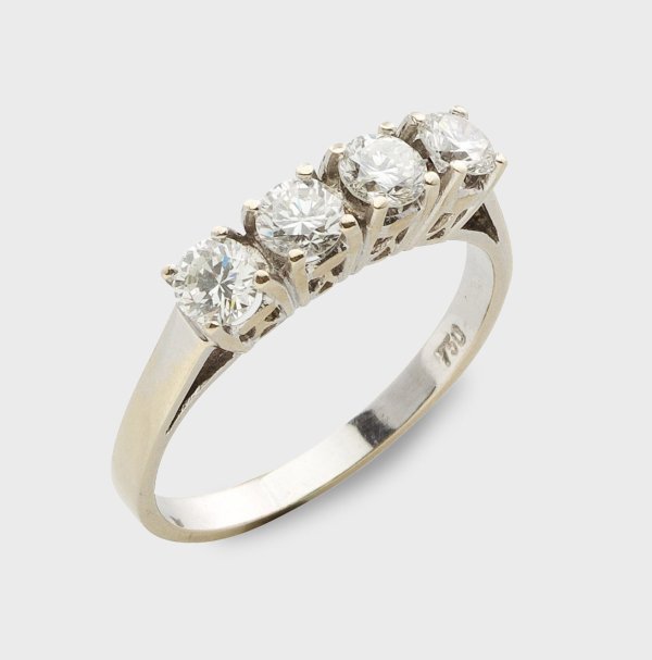 Weißgold, gest. 750. Linear besetzt mit 4 Brillanten von zus. ca. 0,80 ct. (I-J/si1-3), 1 Stein minim. Chip. Gew. ca. 3,85 g.
