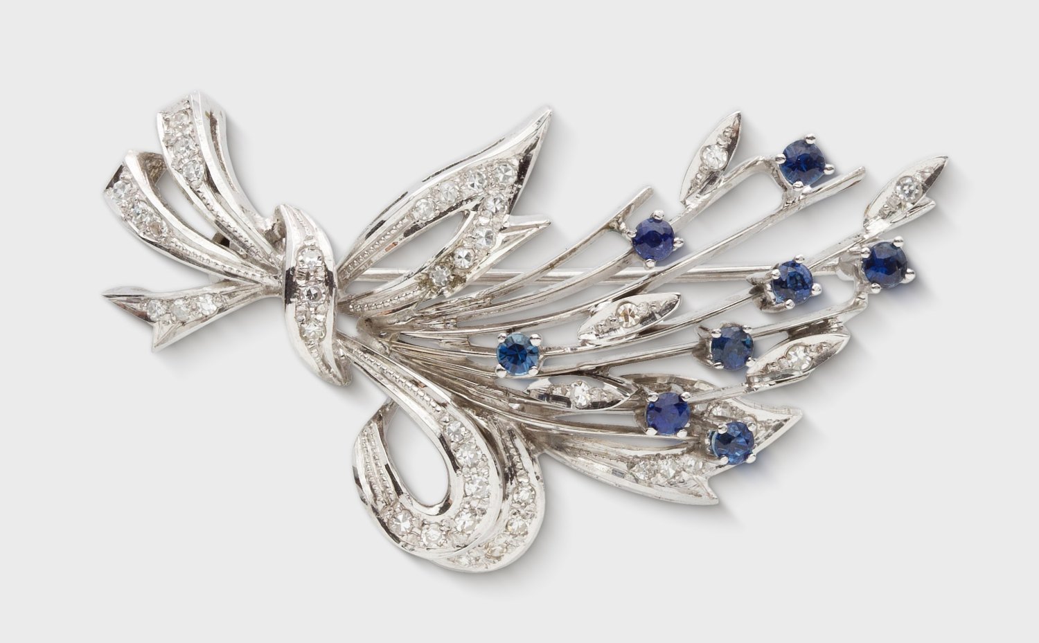Brooch set with sapphires of approx. 0,40 ct. and 8/8 diamonds, in 18 k white gold.