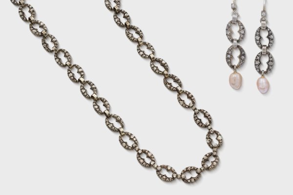Collier mit korrespondierenden Ohrgehängen. Silber. Schauseitig besetzt mit Diamantrosen und 2 roséfarbenen Perltropfen. L. ca. 42 cm. Gew. ca. 46,98 g.