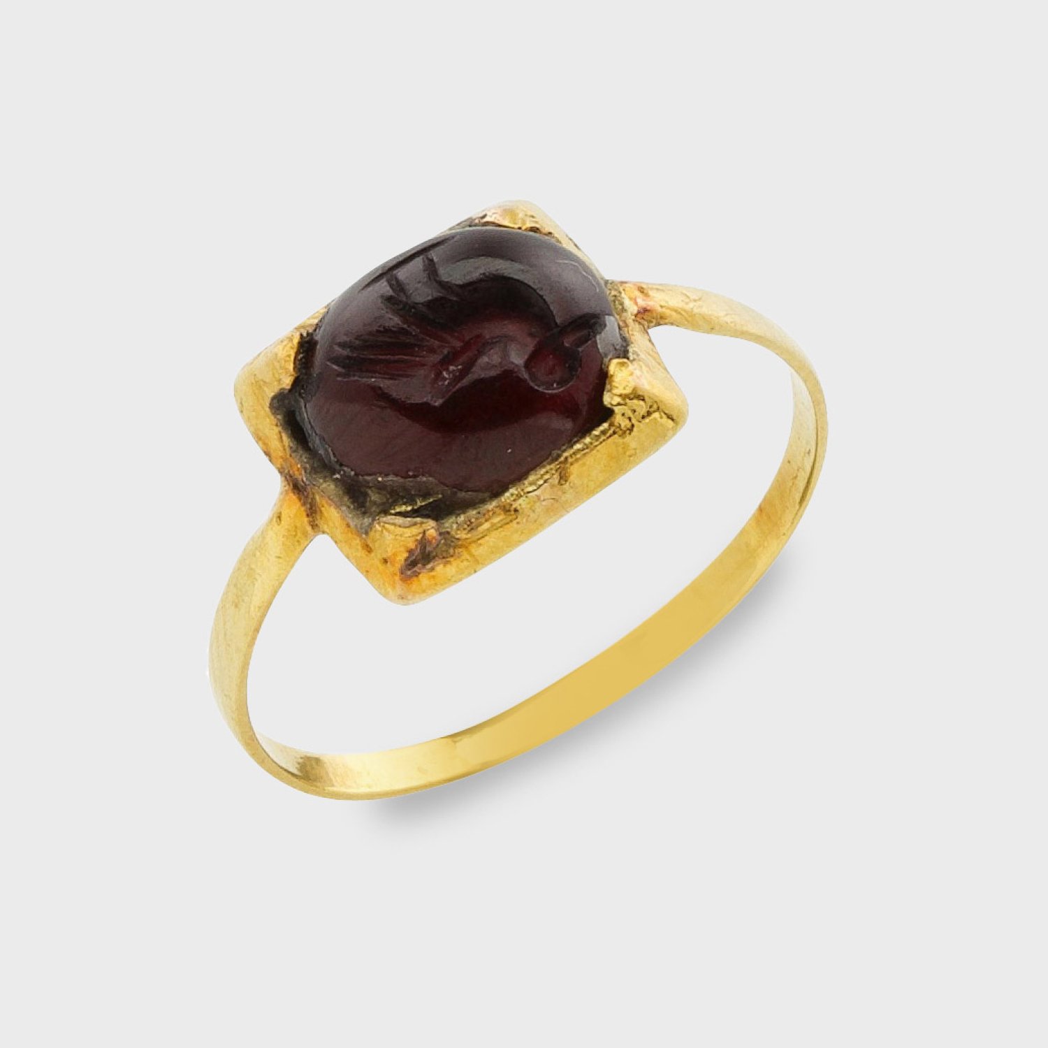 Gelbgold, 21 k. Zentral besetzt mit einem roten Glasstein mit vertieft geschnittener Vogeldarstellung. Gew. ca.1,96 g.