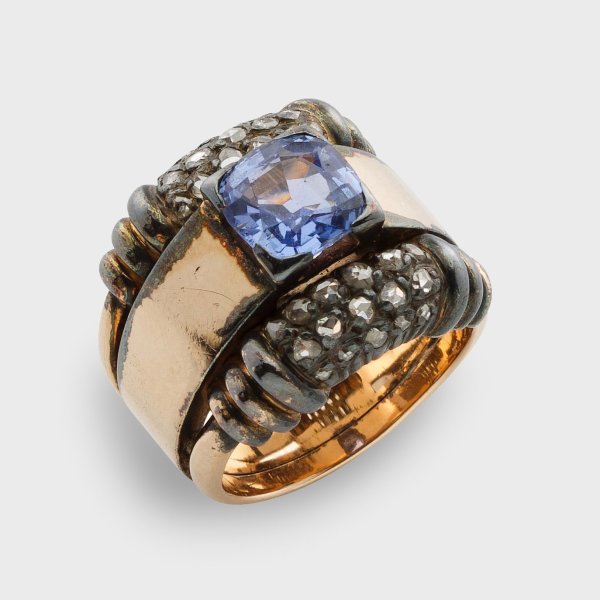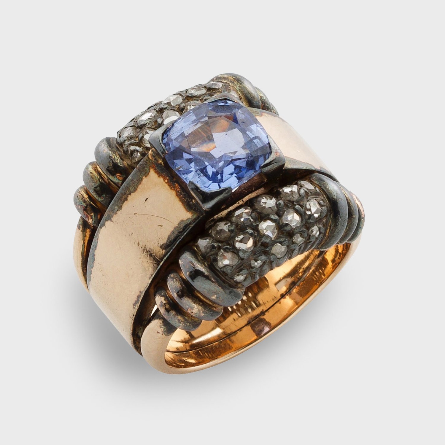 Ring set wih a cornflower blue stone and antique diamonds, in 14 k red gold.
