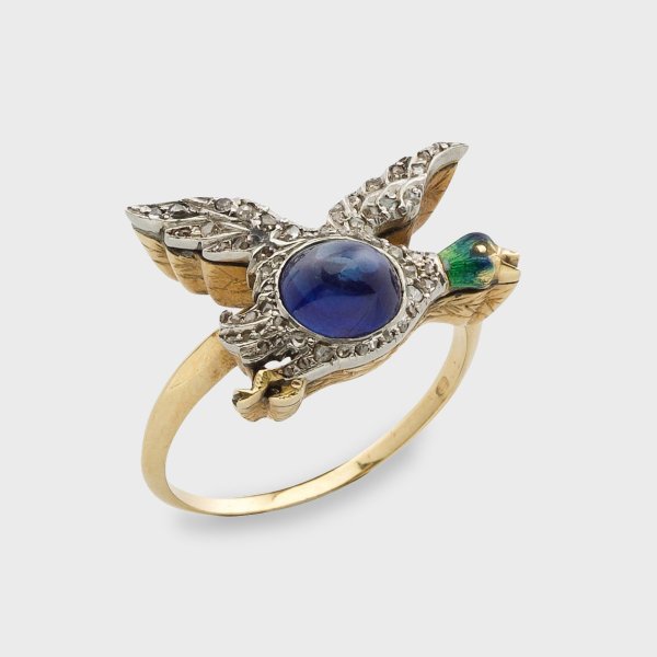 Gelbgold, 14 k, teilw. emailliert. Plastisch gestaltete Ente, besetzt mit einem Saphir-Cabochon und Diamantrosen. Gew. ca. 5,41 g.