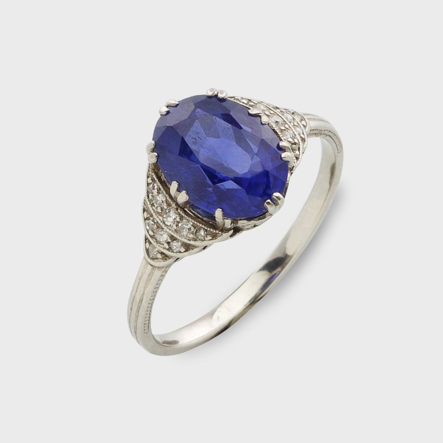 Platin. Zentral besetzt mit einem vivid blue-Saphir von ca. 2,00 ct., flankiert von Diamantrosen. Gew. ca. 3,51 g.