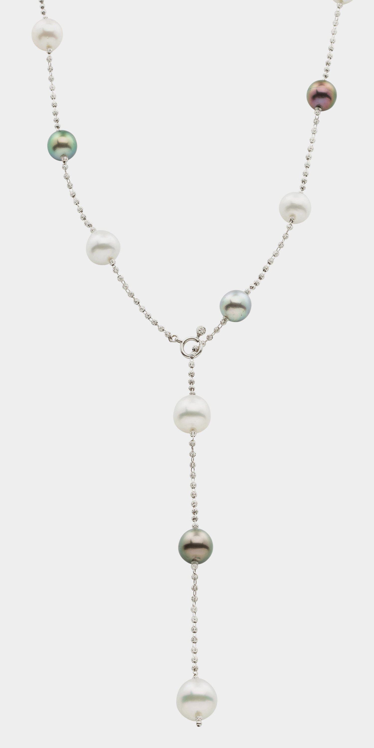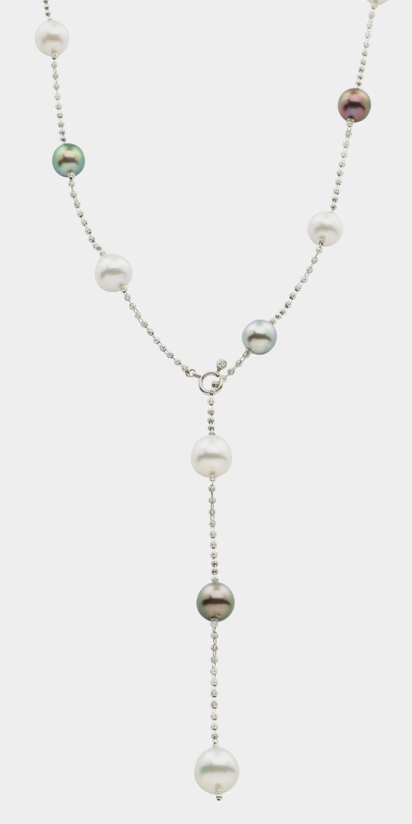 Weißgold, gest. 18 k. Einreihige Kette besetzt mit Tahiti- bzw. weißen Südsee-Perlen von ca. 10 mm, in farbintensivem, rosé-grün changierendem Lüster, getrennt durch facettierte Gold-Perlchen. L. ca. 80 cm. Gew. ca. 35,69 g.