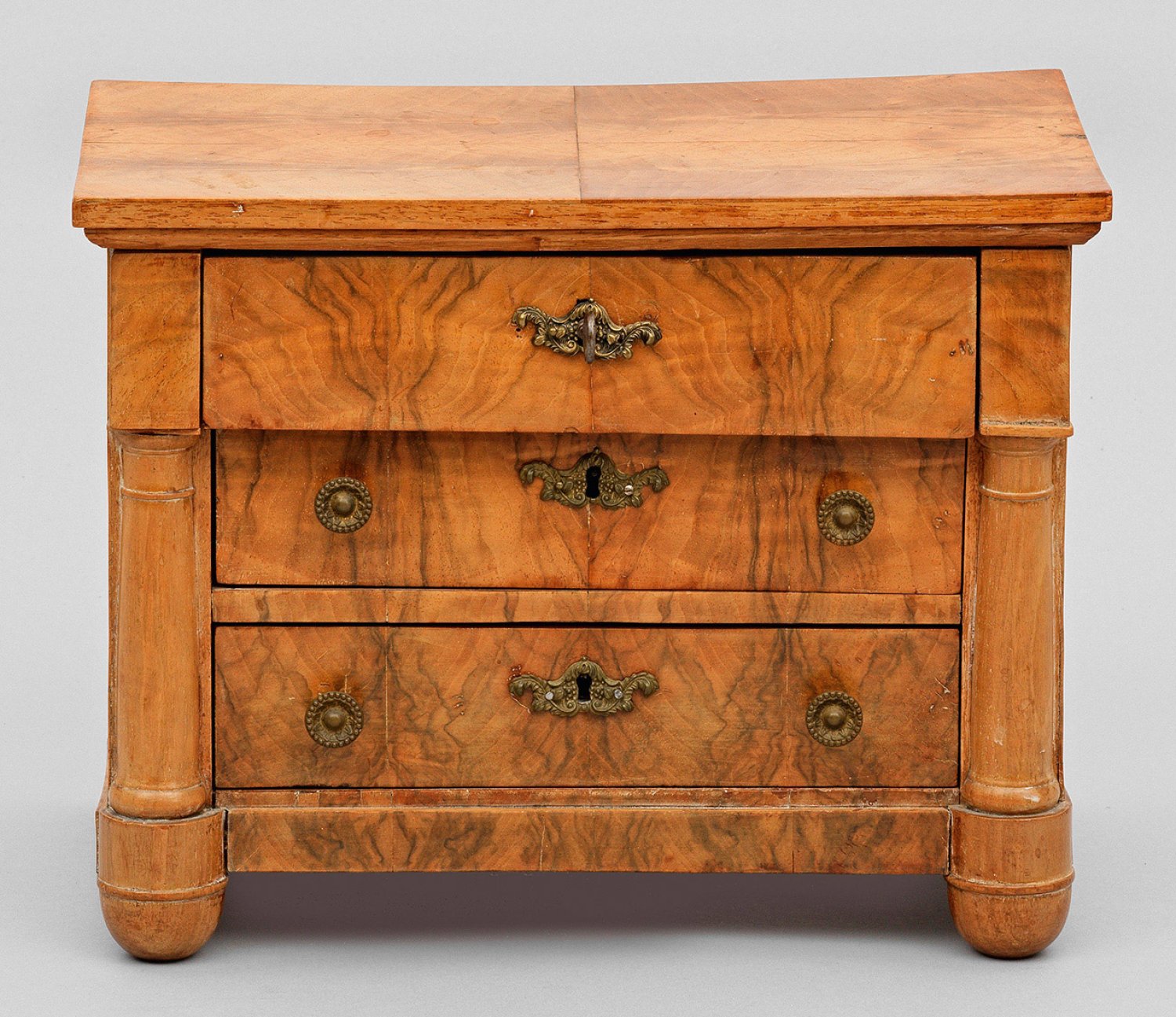 Helles Nussbaum, furniert. Gerader, querrechteckig angelegter Korpus auf gerundeten Füßen. In der gegliederten Front drei, teilw. vorkragende Schubladen, flankiert von eingestellten Halbsäulen. H. 26 cm. 33,5 cm x 21,5 cm.