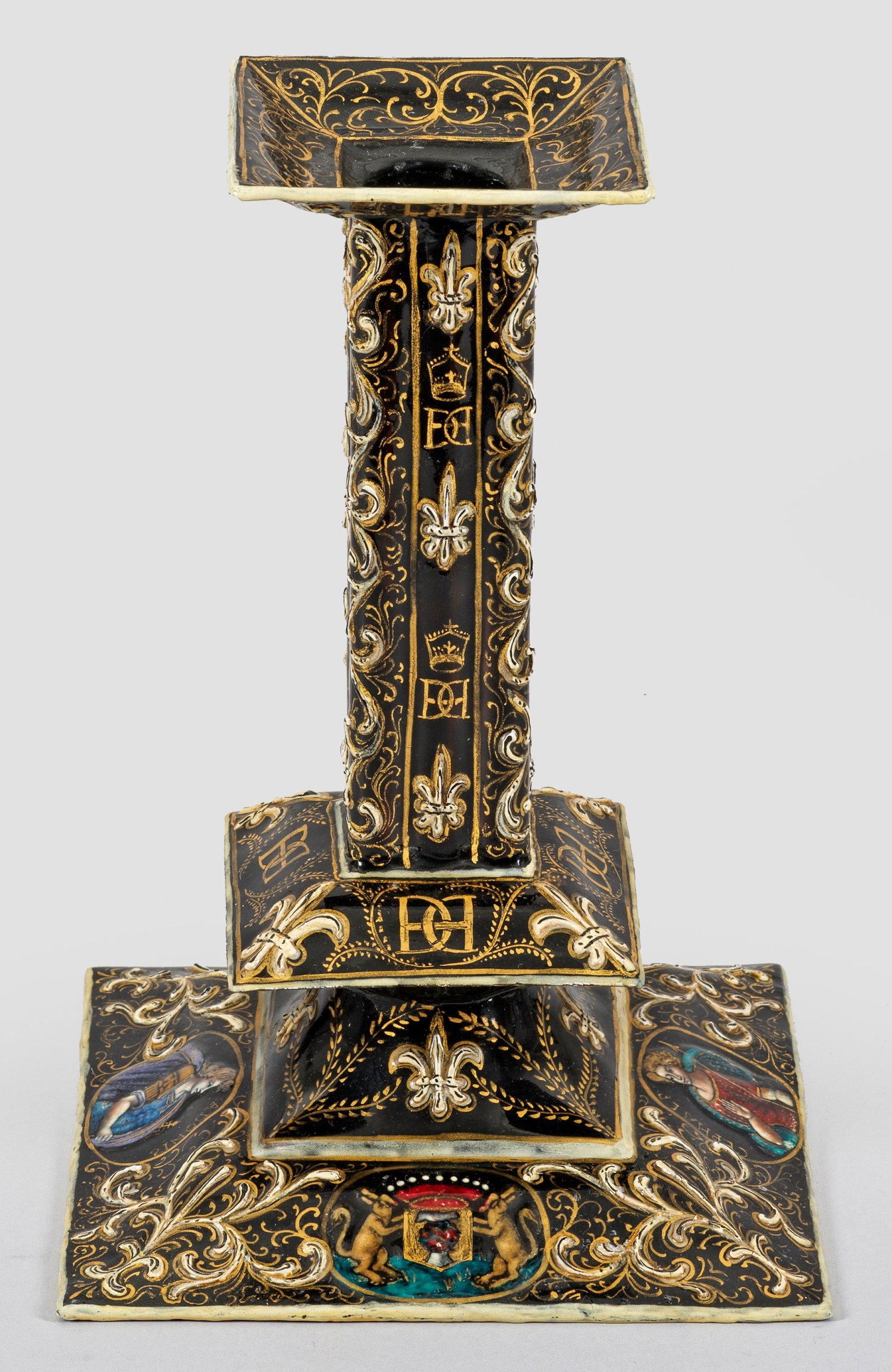 Email auf Kupfer. Architektonisch gegliederte quadratische Form mit weit ausgestelltem Fuß und durch ein vorkragendes Gesims abgesetztem Bündelschaft sowie tiefer Tülle mit rechteckiger Traufschale. Reicher, fein ausgeführter Dekor mit drei Porträts und einer Wappendarstellung unter Grafenkrone in Kartuschen rund um den Stand sowie nahezu flächendeckenden Blattranken. Porträtkartuschen bez. "L Aurore", "Adonis", "Cephale". Ligiertes Spiegelmonogr. "DD", sign. "I. R", wohl Julien Robillard. Ber./Rest.; H. 23