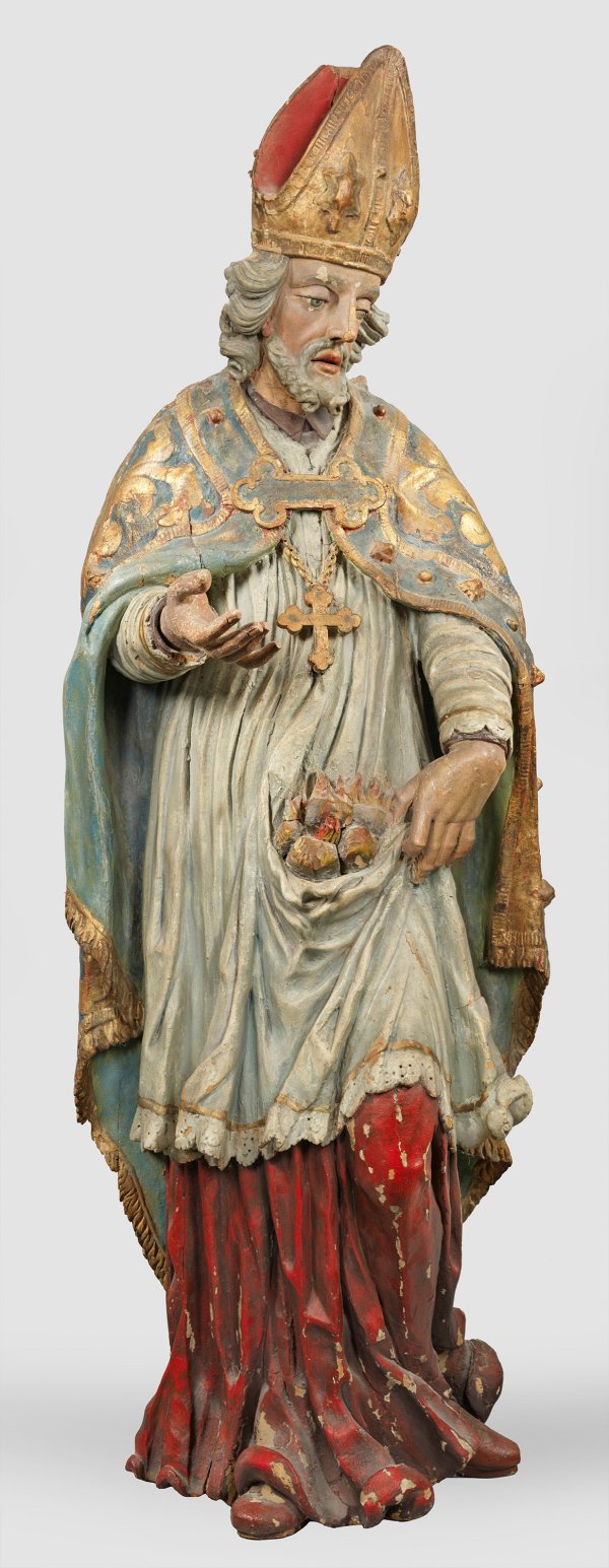 Lindenholz, vollplastisch geschnitzt und farbig gefasst. Rundumsichtig komponierte, nahezu lebensgroße, künstlerisch qualitätvolle Ganzfigur wohl des Erzmärtyrers Hl. Stephanus im Bischofsornat, in beredter Bewegung und Gestik agierend. Als kennzeichnendes Attribut Steine in seiner Schoßfalte darbietend, in der rechten Hand fehlt wohl der Märtyrer Palmzweig. Teilw. polychrome Fassung verloren, rest.; H. 151 cm.