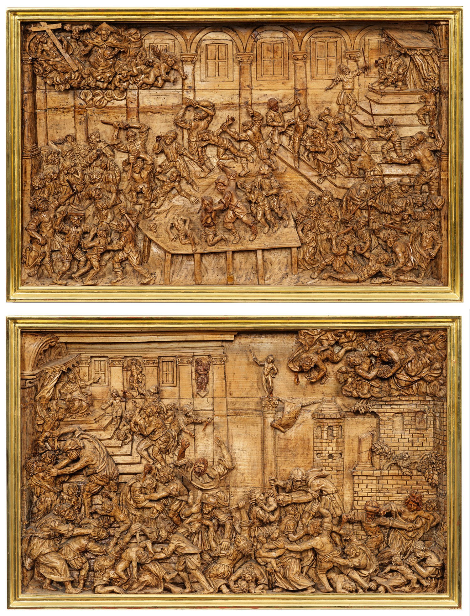 Gegenstücke. Lindenholz, geschnitzt. Querrechteckige, vielfigurige Bildfelder mit sehr tiefen und überaus reliefplastisch ausgeführten Darstellungen in unterschiedlichen architektonischen Zusammenhängen. Beim Bethlehemitischen Kindermord (bzw. Kindermord in Bethlehem) hat der Bildschnitzer die Szene in eine Stadtarchitektur vor die Treppen des Palastes des Königs Herodes verlegt, wobei er wohl durch einen Kupferstich Sébastien Vouillemont nach Raffael aus dem Jahr 1641 inspiriert wurde. Nach der Weihnachtsgeschichte des Matthäusevangeliums (Mt. 2,16) soll der König die Tötung aller männlichen Kleinkinder im Alter bis zu zwei Jahren in Bethlehem angeordnet haben, um den neugeborenen König der Juden - Jesus von Nazareth zu beseitigen. Genau dies wird auf dem Relief geschildert - links oben der am Ende einer hohen Treppe thronende Herodes unter einem Baldachin; unter ihm auf der Treppe und im Vordergrund spielen sich dicht gedrängt die brutalen Szenen der Ermordung durch die Schergen des Herodes ab. Die Verzweiflung der Eltern und deren Versuche, dem Morden zu entkommen wird eindringlich gezeigt. In der rechten oberen Ecke sind mehrere große Engel in Wolken mit Pinienzapfen und Pinienzweigen zu sehen, wodurch die Szene ganz anschaulich einen christlichen Bezug erhält, da die Pinie im Christentum als Lebensbaum gilt, ihre Zapfen als Symbole der Auferstehung und der Unsterblichkeit. Die ikonographische Deutung der zweiten Relieftafel wirft hingegen einige Rätsel auf, denn hier spielt sich eine Hinrichtungs- bzw. Martyriumsszene von vielen Männern und Frauen im Inneren eines Palastes ab. Bei der dargestellten Szene dürfte es sich um eine Christenverfolgung unter einem römischen Kaiser handeln. Wie Herodes thront dieser, mit einem Lorbeerkranz bekrönt, ebenfalls unter einem Baldachin an der Spitze einer hohen Treppe. Ihm gegenüber ist in der linken oberen Ecke die Dreifaltigkeit aus Gottvater, Jesus Christus und Heiligem Geist zusammen mit kleineren Engeln dargestellt, wodurch auch dieses Relief eindeutig einen christlichen Kontext erhält. Jeweils 64 cm x 101 cm. Rahmen.
