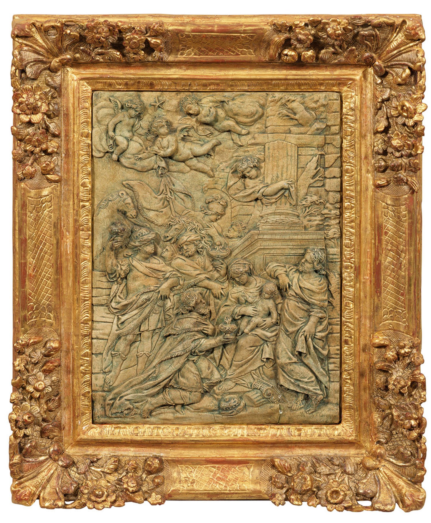 Moderne Museums-Replik aus heller Gipsmasse auf Holzpaneel. Abguss des Holzreliefs mit Anbetung der