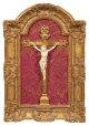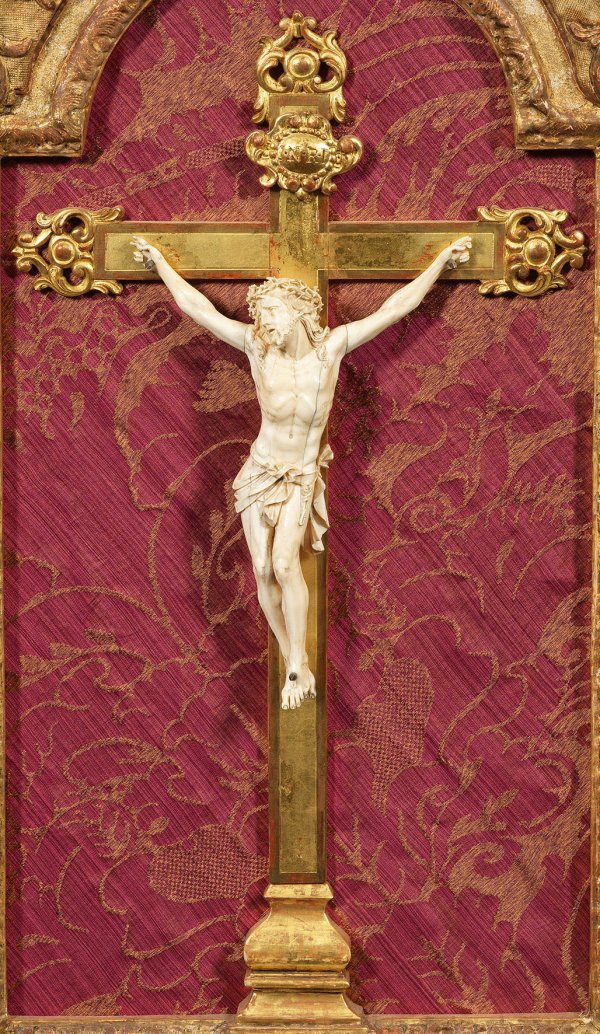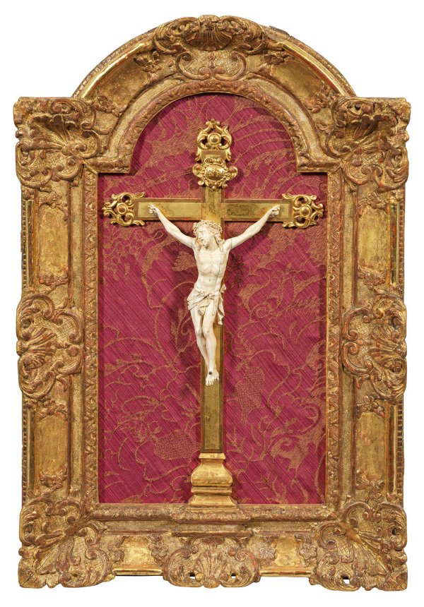 Holz und Elfenbein, vollplastisch gearbeitet. Sehr fein geschnitzte Darstellung des Gekreuzigten im Dreinageltypus. Das Lendentuch mit einer Kordel in aufwendigen Bewegungen drapiert. Das bärtige Haupt mit schmerzerfülltem Ausdruck zur rechten Schulter geneigt, auf dem langen, gewellten Haar die Dornenkrone. Montiert auf einem reich verzierten Holzkreuz, oberhalb mit Schriftrolle "INRI". Blattvergoldeter, mit Muscheln und Rankenwerk plastisch verzierter Barockrahmen. Minim. best.; Rahmen 83 cm x 53 cm. Korpus-H. 26,5 cm.