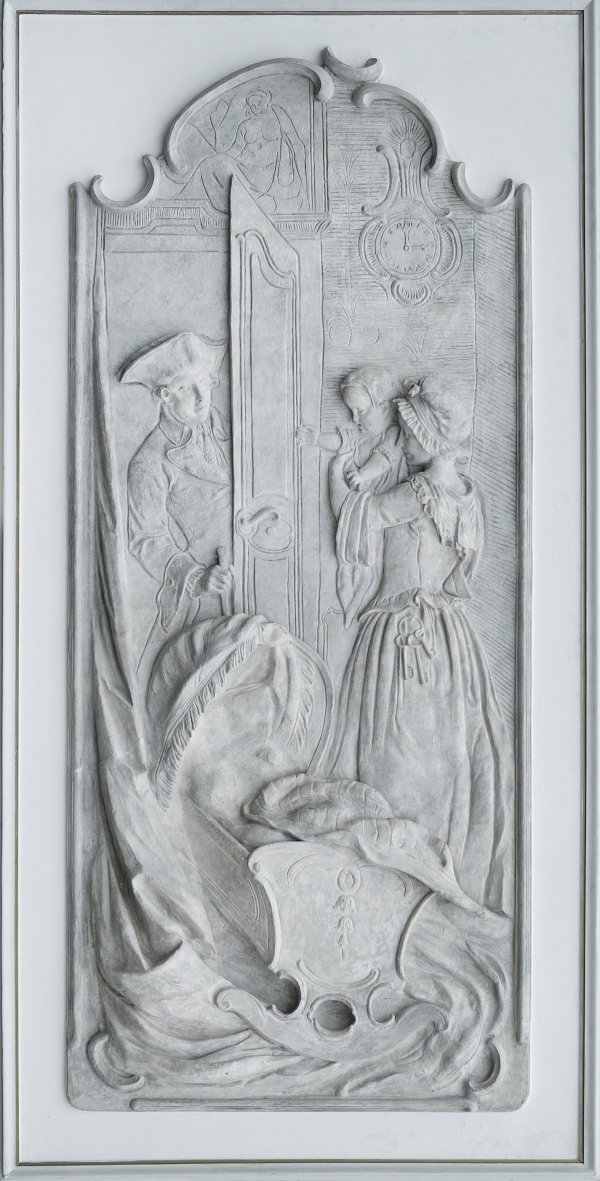 Stuck, teilw. im Relief gearbeitet. Repräsentative Wandvertäfelung für ein Palais aus einer Folge von zumindest drei reliefplastischen Szenen, welche das Leben eines Edelmannes schildern. Diese Tafel zeigt einen Herren, in das Interieur blickend, in dem eine Wiege mit Kind steht und eine Dame ein Kind auf dem Arm hält, welches den Mann begrüßt. Zwei weitere Gegenstücke (in dieser Auktion) mit Darstellungen des familiären Glücks komplementieren die Folge. Altersspuren. Holzrahmen. Ges. ca. 250 cm x 130 cm. Relief ca. 220 cm x 96 cm.