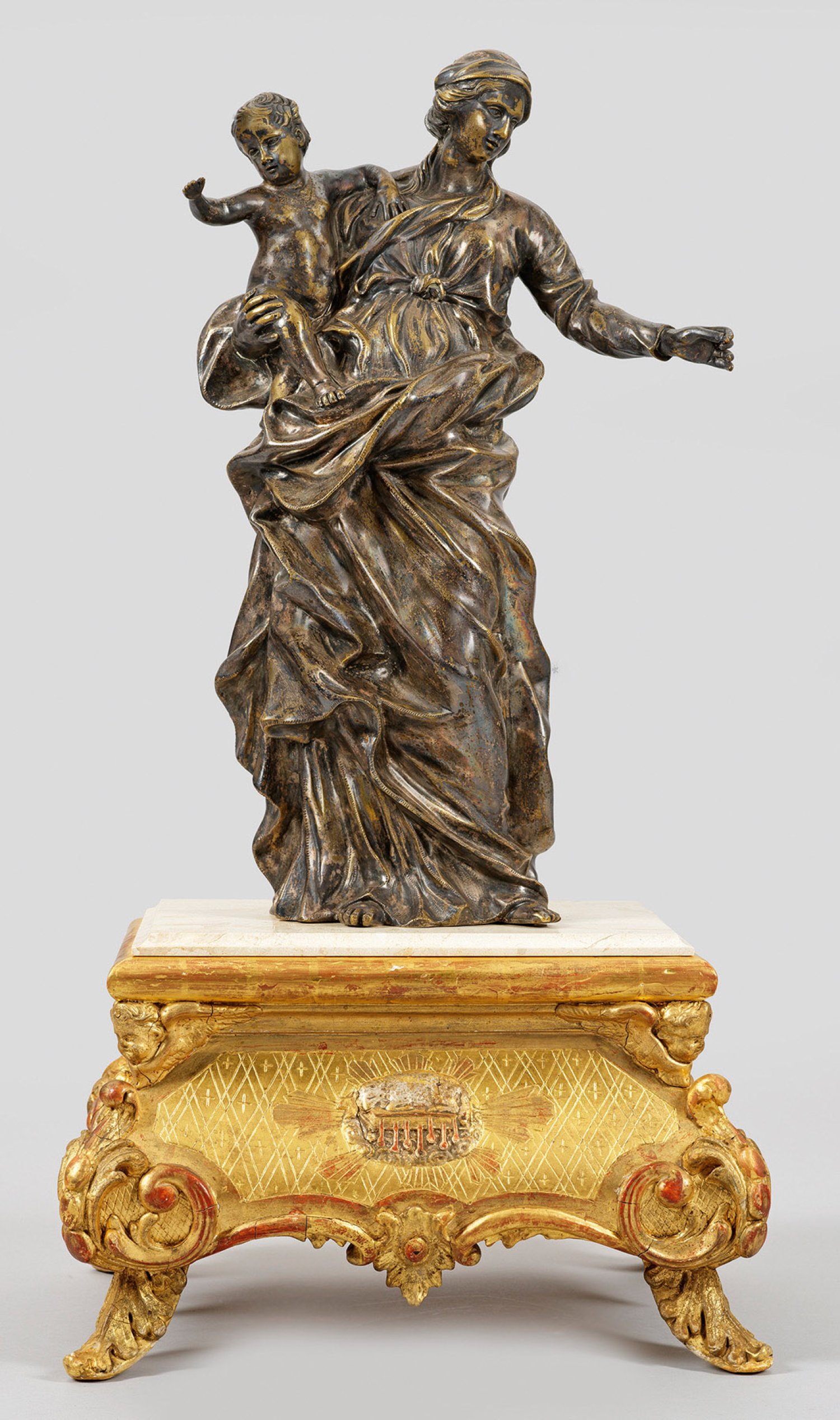 Bronze, versilbert. Vollplastische, lebendig bewegte, barocke Darstellung Mariens mit ausgestrecktem linken Arm, gegenüber das sich nach rechts wendende Kind. Algardi gilt neben Bernini als Hauptmeister der römischen Barockskulptur. Er war ein Meister in der Gestaltung kleinformatiger Skulpturen für den Metallguss. Die feinen Züge der Jungfrau mit dem Kind, die sorgfältige Gestaltung des Mantels und die anmutig ausgewogene Komposition sind Markenzeichen des römischen Bildhauers. Algardi hatte einen hochentwickelten Sinn für dreidimensionale Formen und seine Fähigkeit, Details zu einem vollendeten Ganzen zusammenzufügen, erreichte ihren Höhepunkt um 1650, als er das Modell für die vorliegende Madonna schuf. Es ist in mehreren Bronzeversionen bekannt und Bronzegüsse der Originalkomposition waren in ganz Europa weit verbreitet und trugen zur Verbreitung des italienischen Barockstils bei. Zudem wurde die Skulptur auch in anderen Materialien wie Holz und Elfenbein umgesetzt. Exemplare der Bronze-Madonna von bzw. nach Algardi befinden sich u. a. im Metropolitan Museum of Art in New York, Harvard Art Museum und Bode-Museum in Berlin. Platzierbar auf einem beigefügten, späteren, geschnitzten u. vergoldeten Holzsockel mit reliefiertem, schlafenden Lamm und polierter Kalkstein-Deckplatte. Bronze-H. 47 cm.
