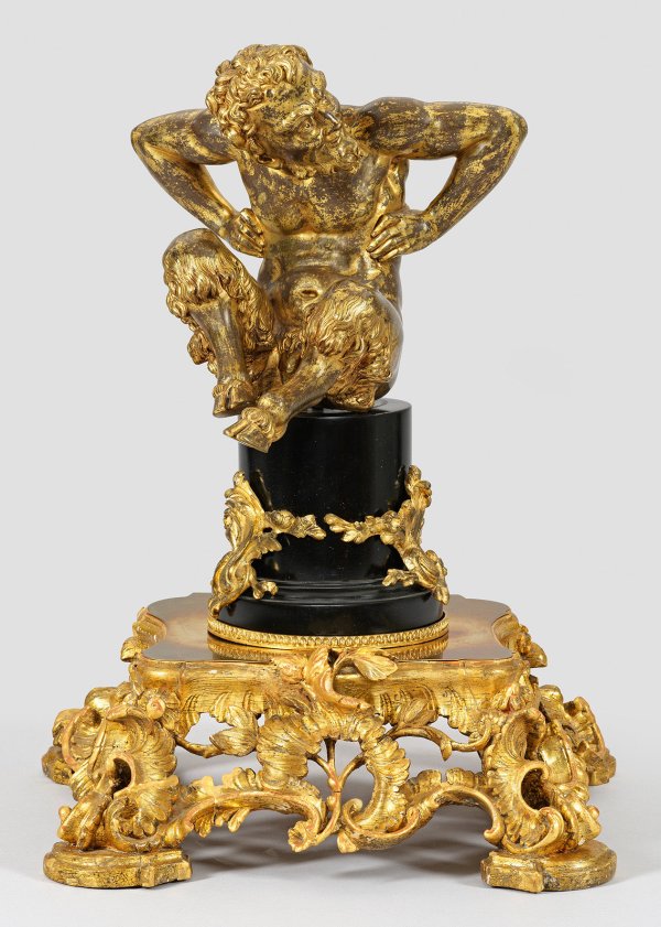 Bronze, ziseliert und vergoldet. Vollplastische, dynamische Darstellung des älteren Faun mit expressiv nach links gewendetem Blick. Die Louis XV-Figur montiert auf ebonisiertem Säulenpostament mit vergoldeten Bronze-Rocaillen-Appliken. Platzierbar auf gesondertem, durchbrochen gearbeitetem, geschnitztem und vergoldetem Holzsockel mit reliefplastischen Rocaillen und Blüten sowie Messing-Deckplatte. Faun ca. 25 cm x 27 cm x 27 cm. Ges.-H. ca, 54 cm.